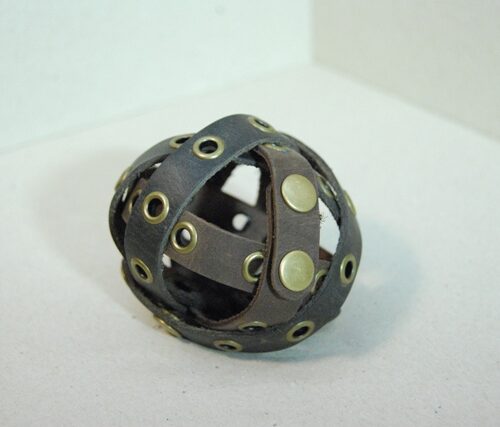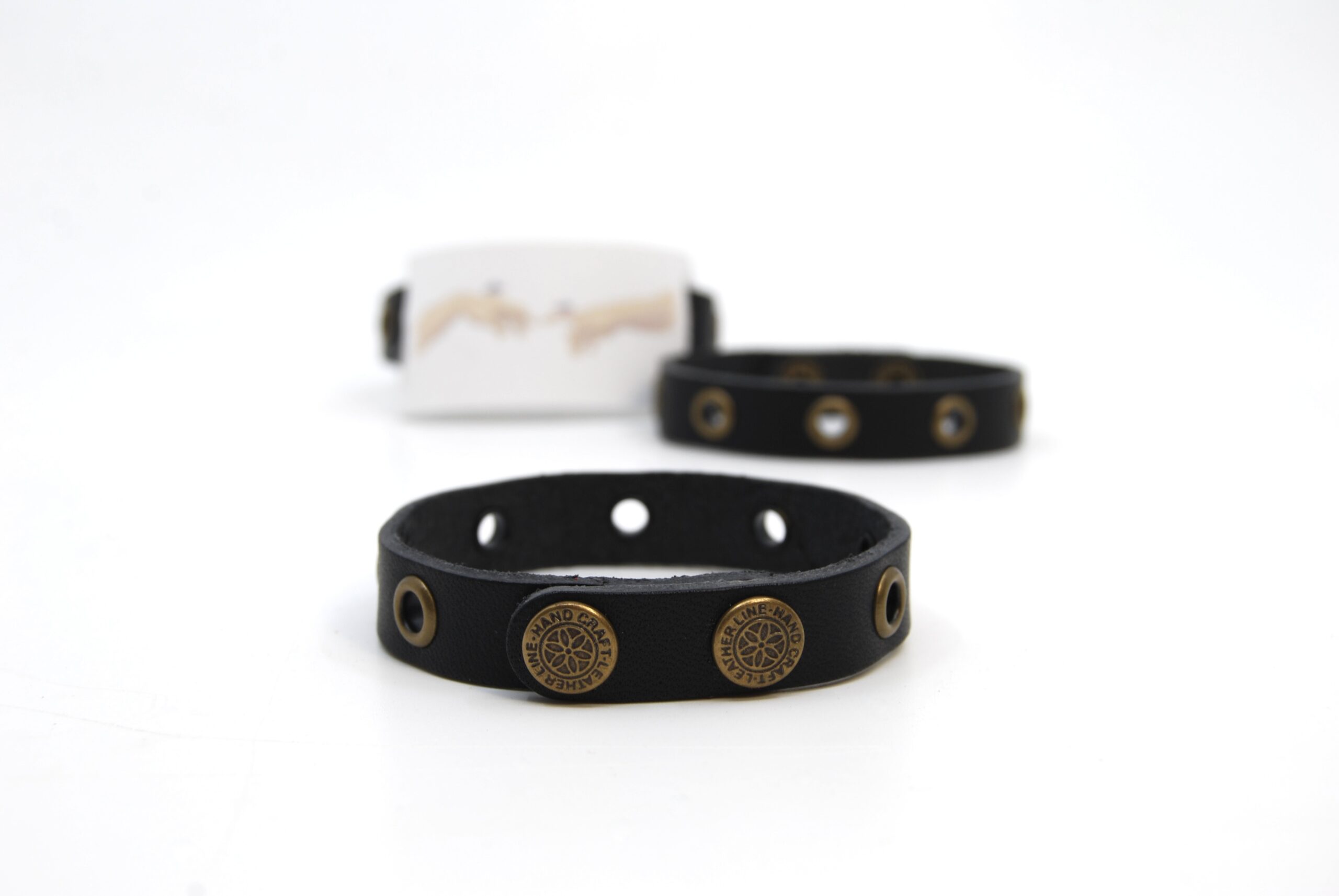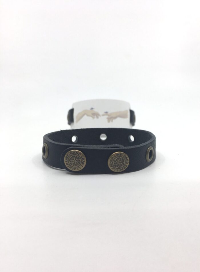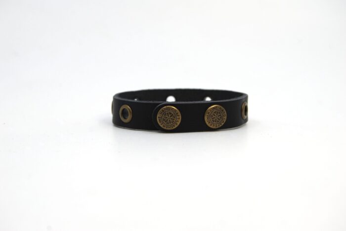 Juodos spalvos odinė apyrankė dekoruota bronzinės akutėmis susegama dvejomis spaudėmis